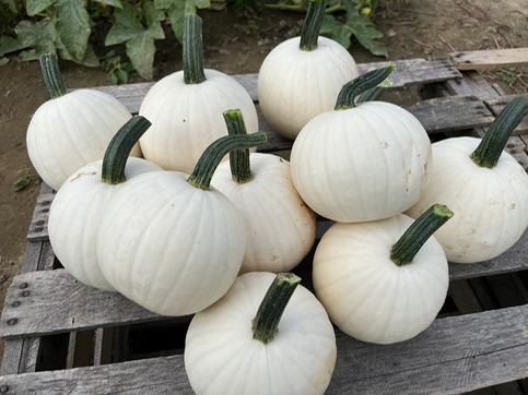 Elektra : Is a small 2-3 pound white pumpkin with the stay white gene and PMR. Elektra is a has a very prolific plant with a cluster set producing 4-7 fruit per plant.