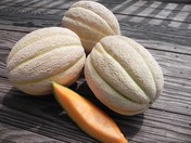 Hannah's Choice : The 6-1/2 x 5-1/2" large sutured/netted oval fruits average 3–5 lb. Its rich green rind contrasts with the deep orange flesh. Kudos to the Cornell University breeding program for developing this gourmet melon. At trials in both Freeville and Jamesport, NY, it had an astonishing 96% marketable fruits by weight besting Delicious 51, Earliqueen, Athena and Burpee Hybrid in color, depth, Brix and over-all quality. Resistant to PM, tolerant to F2, ZYMV, PRSV, WMV.